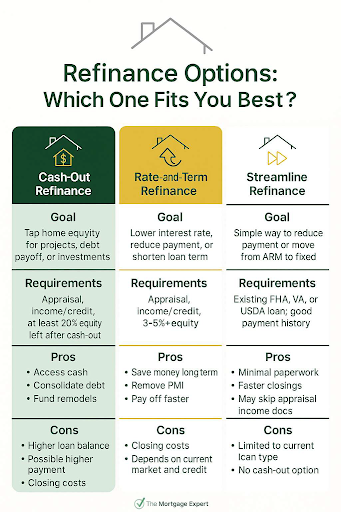 FHA Streamline: Often does not require income documents or an appraisal if you meet program rules. Designed to reduce your payment or move to a lower rate.